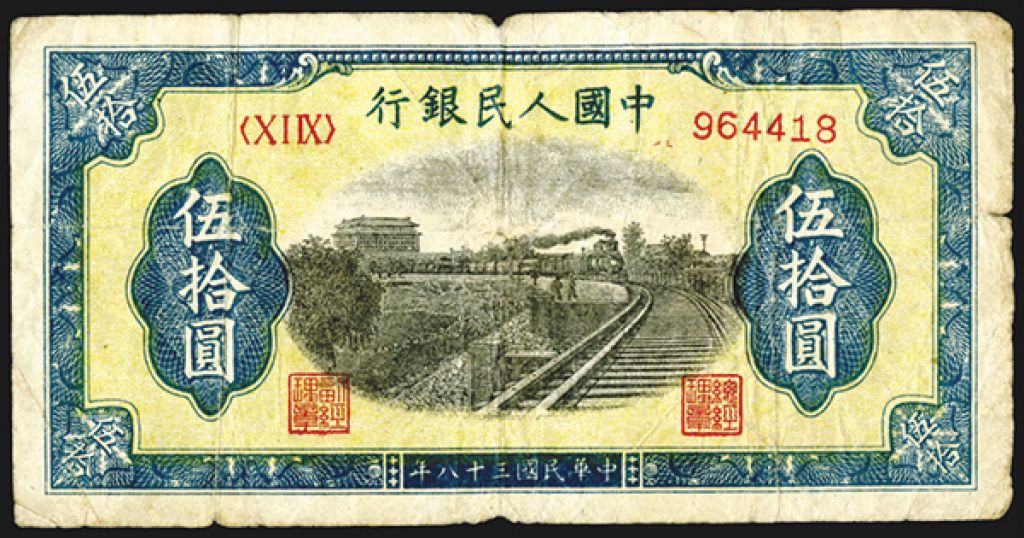 2029 Peoples Bank of China, 1949 Issue. China, 50 Yuan, P-829 (S/M#C282-35), Issued banknote, Dark blue and black on light yellow, train, Block X I IX, S/N 964418, Fine with small notches on the top and bottom borders due to wear.