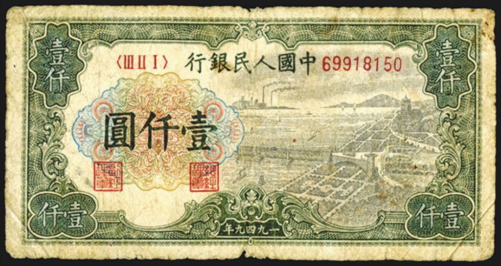 2035 Peoples Bank of China, 1949 Issue. China, 1000 Yuan, P-847 (S/M#C282-61), Issued banknote, Black for m/c guilloche, back purple, Block 321 (III II I), S/N 69918150, VG-Fine.