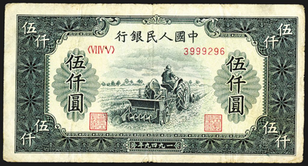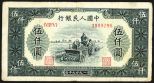 2038 Peoples Bank of China, 1949 Issue. China, 5,000 Yuan, P-851 (S/M#C282-65), Issued banknote, Dark Gray Green on m/c, tractors, back green, Block VI IV V (645), S/N 3999296, VF to Choice VF.