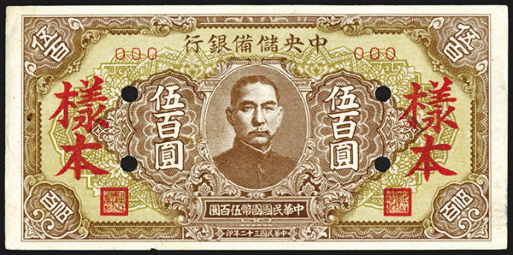 Central Reserve Bank of China, 1943 Specimen Issue. China, 500 Yuan, P-J27s, S/M#C286-95,Specimen banknote, 169mm x 84mm, Brown, SYS at center, Yang Pen on face, Specimen on back, S/N 000, AU condition, Scarce as specimen.