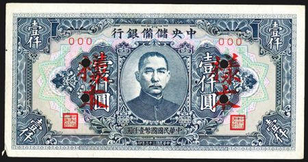 2044 Central Reserve Bank of China, 1944 Specimen Issue. China, 1000 Yuan, P-J32s, Specimen banknote, 185mm x 94mm, SYS at center, Yang Pen on face, Specimen on back, S/N 000, AU but a very small piece of the lower left corner tip chipping off, Scarc