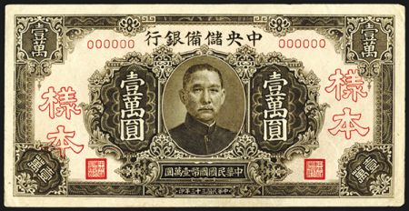 Central Reserve Bank of China, 1944 Specimen Issue. China, 10,000 Yuan, P-J36s, Specimen banknote, 184mm x 94mm, SYS at center, Yang Pen on face, Specimen on back, S/N 000000, AU condition with small paper clip rust spots on back right lower border, Scarce as specimen.