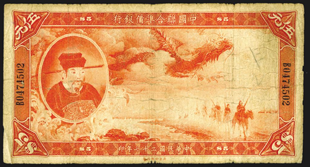 Federal Reserve Bank of China, 1938 Second Issue. China, $5, P-J56, S/M#C286-13, Issued banknote, Orange, Portrait of Yueh Fei at left, Dragon at top right and horse patrol at bottom right, back orange, Fine to Choice Fine condition, S/N B0474502, Rare note in any condition and first time offered by our firm.