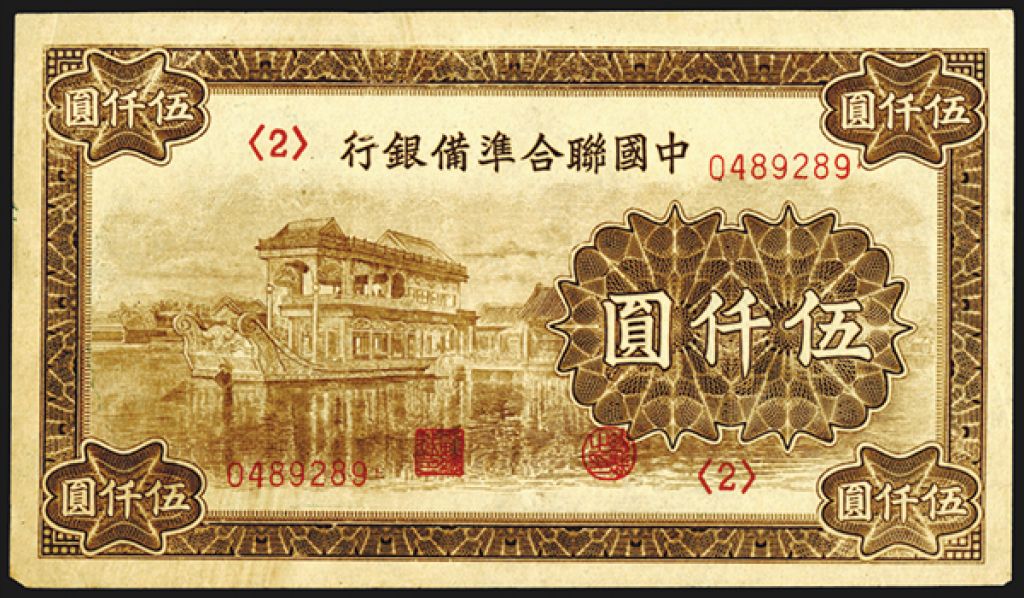 2051 Federal Reserve Bank of China, ND (1945) Issue. China, 5000 Yuan, P-J92a, S/M#C286-95, Issued banknote, Brown, State Stone Barge on left, AU.