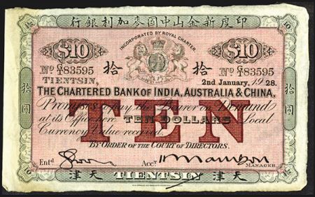 2055 Chartered Bank of India, Australia & China 1928 "Tientsin" Branch Issue, The Second of Two Sequential Notes. Tientsin, China. 2nd January, 1928, $10, P-S203A, (S/M #Y11-31D). Issued banknote. Black border and text with purple underprint, Support