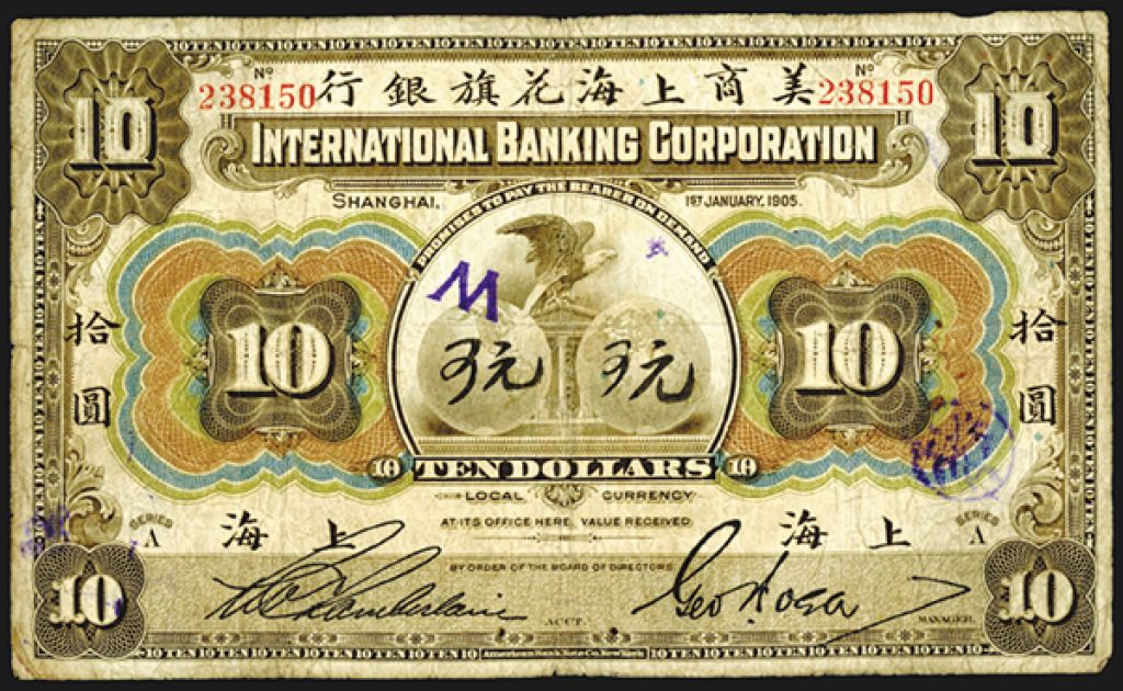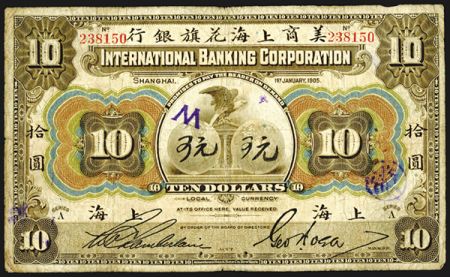 2059 International Banking Corporation, 1905 "Shanghai" Issue. Shanghai Branch, 1905, $10, P-S420 (S/M#M10-3), Issued banknote, Brown on m/c face and orange back, Fine condition. ABNC.