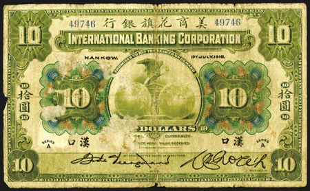 2060 International Banking Corporation, 1918 "Hankow" Branch Issue Banknote. Hankow, China, 1918, $10, P-S407 S/M#M10-41a. Hankow Branch. Issued banknote. VG to Fine with small edge faults on the left margin, ABNC.
