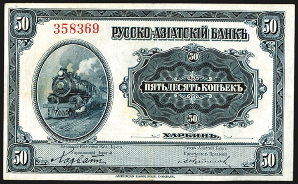 Russo-Asiatic Bank, ND 1917 "Harbin" Issue. China, 50 Kopeks, P-S473, S/M#O5-100, Issued banknote, Locomotive at left, back green and orange-red, Choice VF, possibly pressed, Attractive note. ABNC.