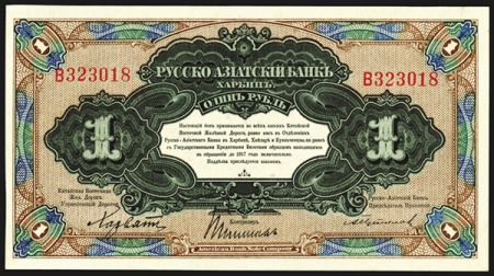 Russo-Asiatic Bank, ND 1917 "Harbin" Issue. China, 1 Ruble, P-S474, S/M#O5-101, Issued banknote, black on orange-brown and m/c, back brown with locomotive, S/N B323018, Choice to Gem Uncirculated, Attractive note and rare in this high of grade. ABNC.
