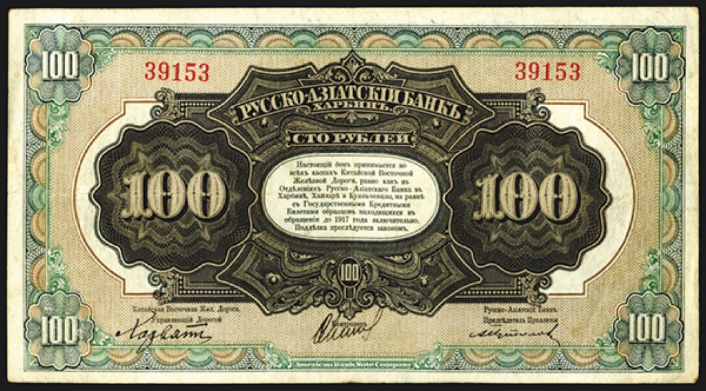 Russo-Asiatic Bank, ND 1917 "Harbin" Issue. China, 100 Rubles, P-S478, S/M#O5-105, Issued banknote, black on tan, green and m/c, back brown with locomotive, S/N 39153, VF to VF+, Attractive note. ABNC.
