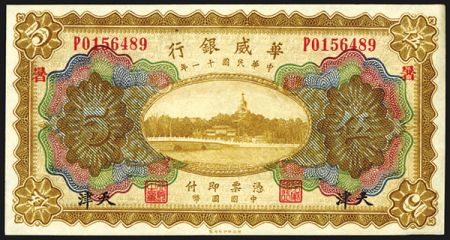 2069 Sino Scandinavian Bank, 1922 "Tientsin" Branch Issue. China. 5 Yuan, S592b, Uncirculated to CU condition. Scarce in high grade.