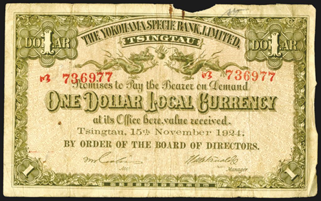 Yokohama Specie Bank, Limited, 1924 "Tsingtau" Branch Banknote. China, $1 Local Currency, P-S757, S/M#H31-150, Issued Banknote, Black and violet, Western Serial numbers, Choice VG to Fine condition with a 15mm by 2mm piece missing from the top middle margin, the back had some tape from previous mounting, Rare note in any condition and a difficult branch issue which is unpriced in SCWPM.
