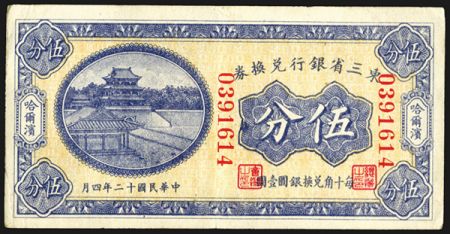 2074 Bank of Manchuria, 1923 Issue Banknote. China, 5 cents, P-S2940a, S/M#T214-150a, Issued banknote, Blue and yellow, back violet and m/c, Choice VF to XF with large even margins, bright colors, sharp corners and firm paper quality. Attractive note
