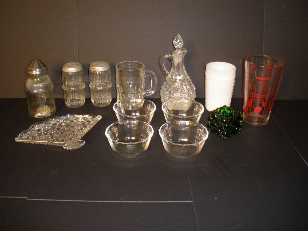 Assortment of Glass. Handled decanter, salt & pepper shakers, custard cups, small fan shaped dish