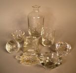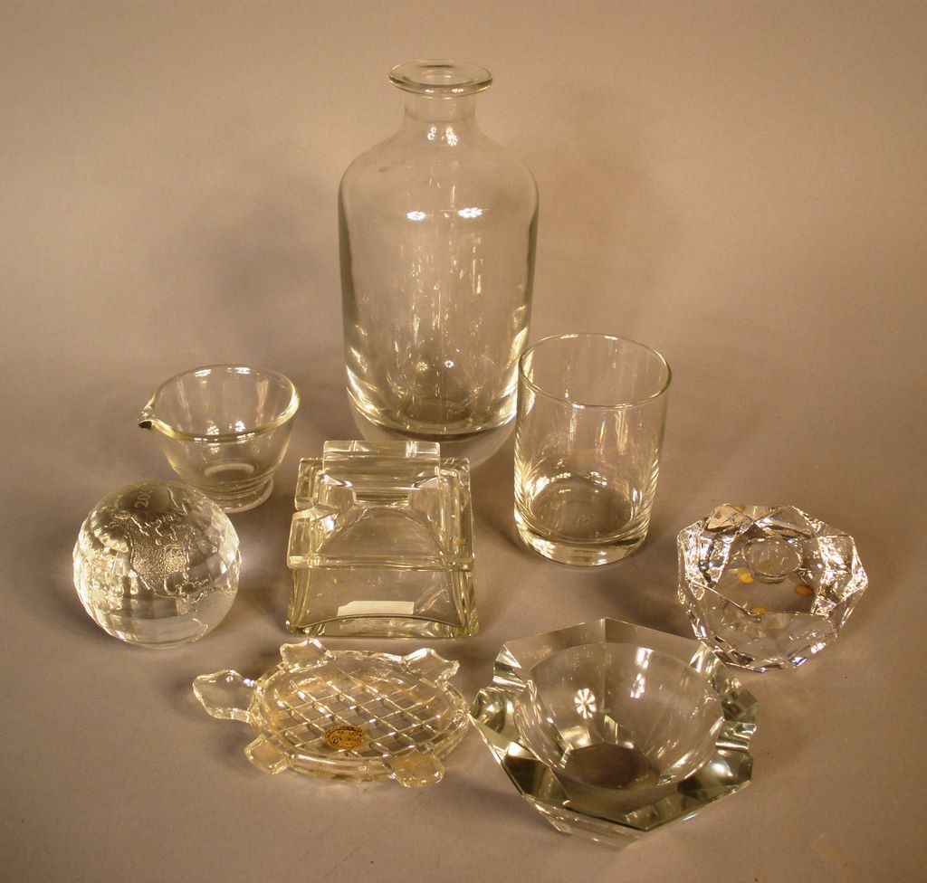 Eight Assorted Items. Old Apothecary Jar, Hand blown; Ground Glass Deco Condiment w/lid; Ground Glass Crystal Ashtray; Orefors Candle Holder; Paperweight; Small Glass Bowl; Turtle Ashtray; Anchor Hocking Glass
