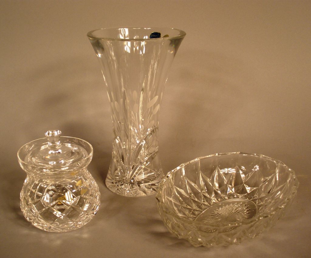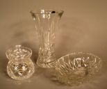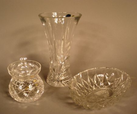 Assorted Crystal Items. Bohemian crystal vase, 8"h; crystal bowl, 7 1/2" oval; Atlantis crystal covered sugar, 4 1/2"h