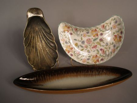 Assorted Trays. Minton "Haddon Hall" Dish, 8 1/2"; Hotel Winton Silver Plate Tray, 9"; Peter Brown Pottery Tray, 13 1/4"