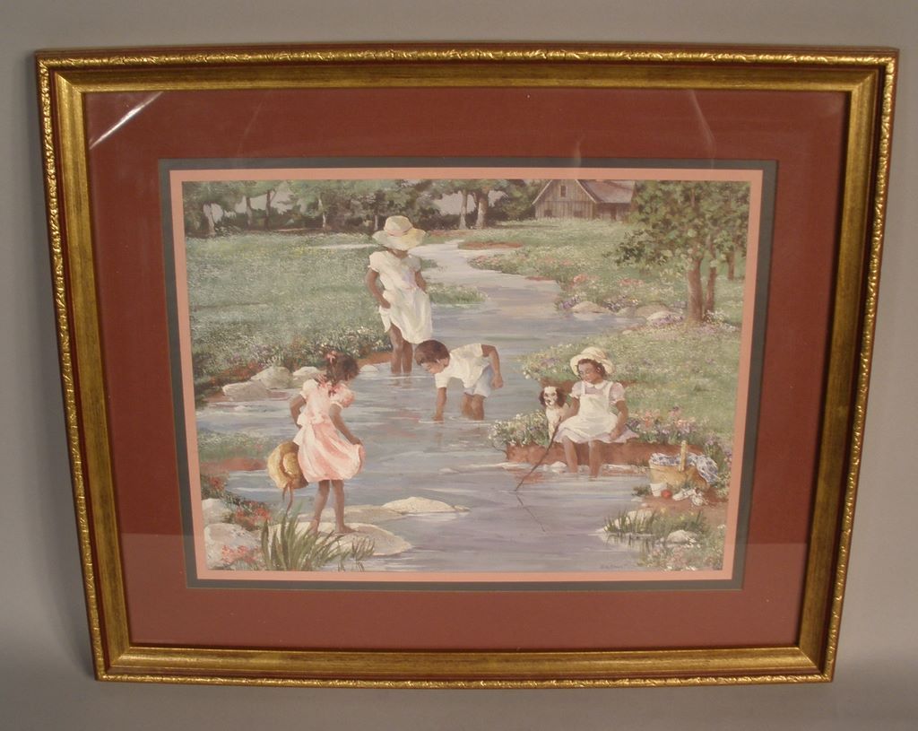 Framed Print of children playing in creek, signed Ann Mount, 18 1/4"w x 15 1/4"h