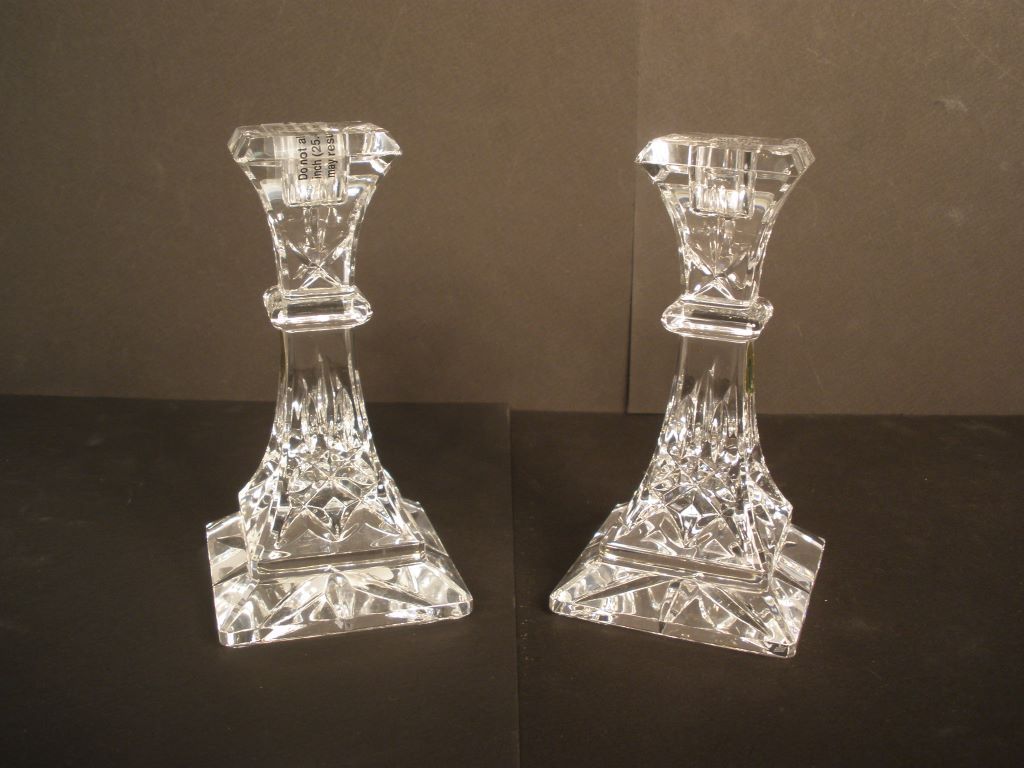 Pair of signed Waterford candle sticks, 6"h x 3"sq. base