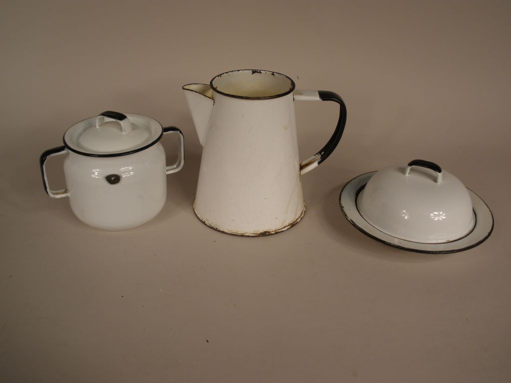 Milk Pitcher, Sugar Bowl, Butter Dish set, all in White Graniteware enamel retrieved from an abandoned wood spool (for thread) mill in the Gaspe Peninsula of Northern Quebec, 1969; pitcher 6 1/2"h, sugar 4"h, dish 7 1/2" base