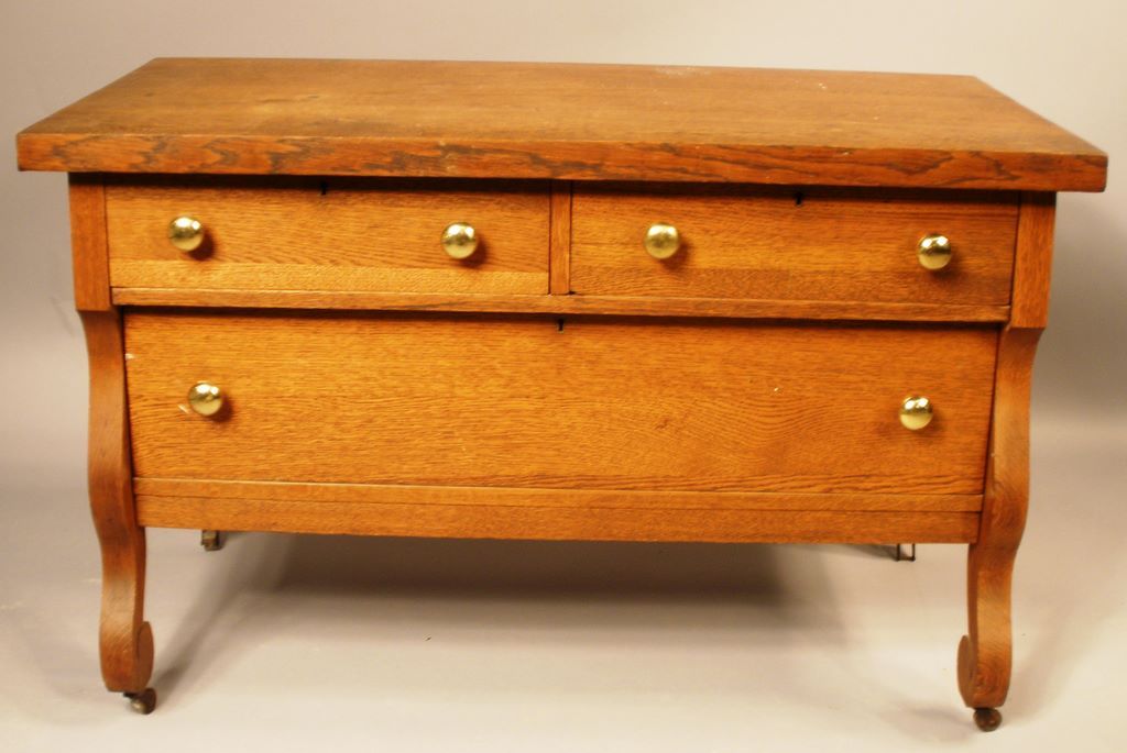 Oak Dresser Base. Three drawers w/brass knobs all on 5 scroll feet, w. 42", d. 22", h. 26 1/2"