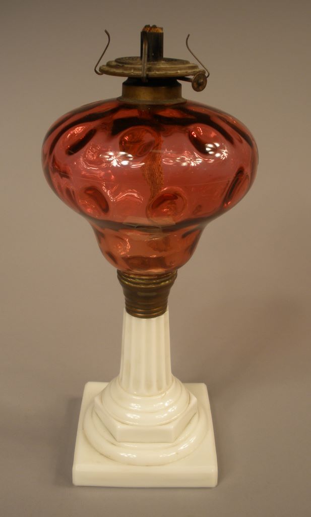 646 c1870 Atterbury Cranberry & Milk Glass Oil Lamp