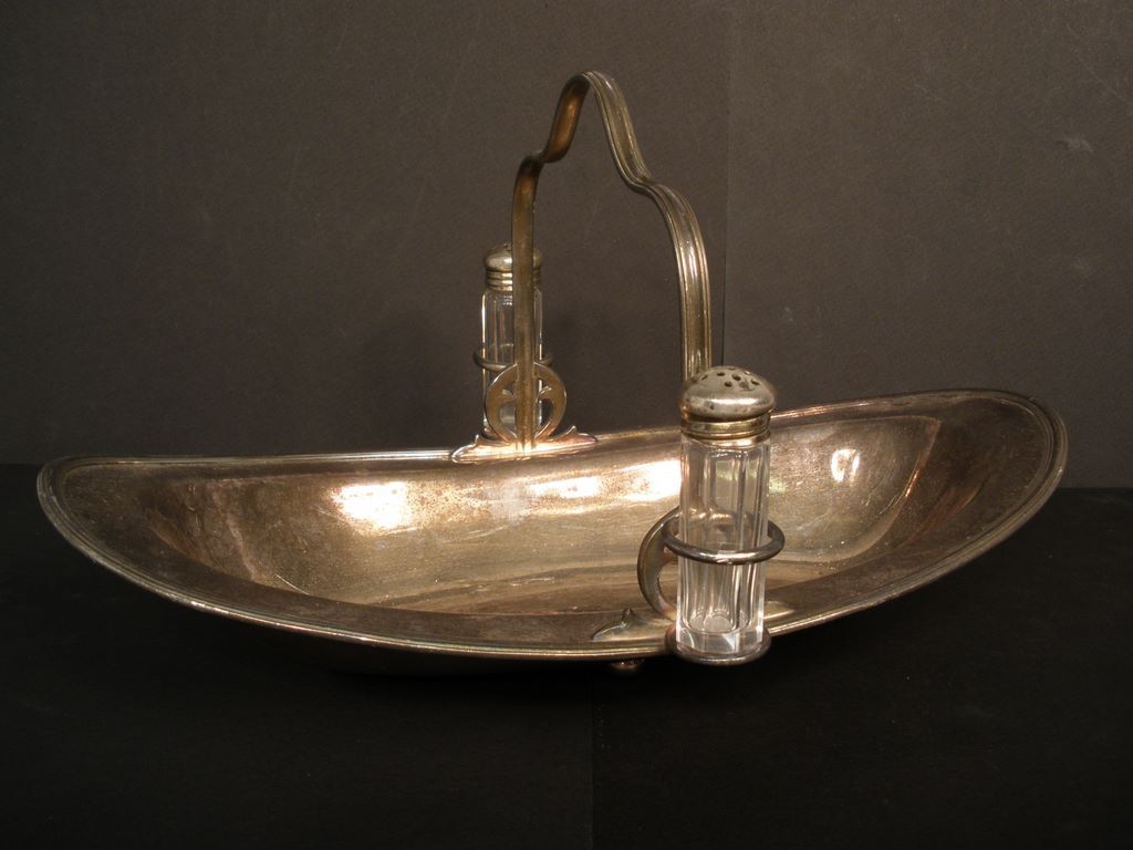 Silver Plate Tray with Handle and salt and pepper shakers attached to side, 13" oval x 7"w