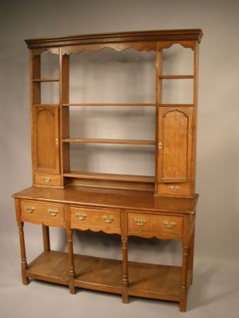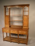 Nice oak 1910's Welch dresser. Decorative top w/3 shelves, 2 doors on each side and drawer beneath. Base has 3 drawers w/turned legs. In original condition. 55"w x 19"d x 79"h