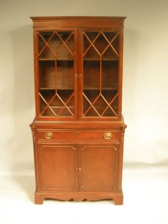 Nice Mahogany Double Door Display Cabinet with wood trim glass doors. Lower section has drawer and double door storage-h. 68" x w. 33" d. 15"