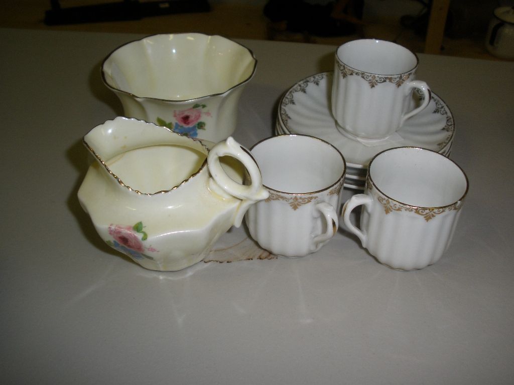 Assorted lot 8 pieces: Demi-Tesse cups and saucers KPM, creamer & sugar, fine bone china.