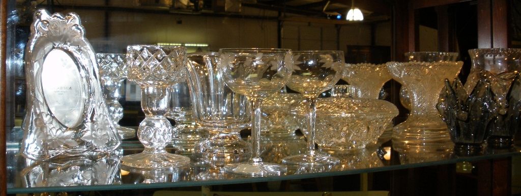 Collection of Pressed Glass, Glasses, Glass Picture Frame, Candle Sticks, Covered Bowl, Hurricane Shade, and More