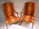 Beautiful pair of French Armchairs. Chairs are upholstered with red and gold designs. The designs contrast beautifully with the mahogany, the mahogany is intricately carved. They are in marvelous condition with no wear in the upholstery. -h. 47" x w. 27 1/2"