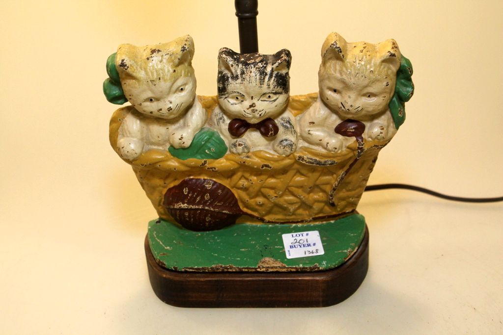 Rare Victorian kitten door stop, mounted as lamp, original paint with burlap shade