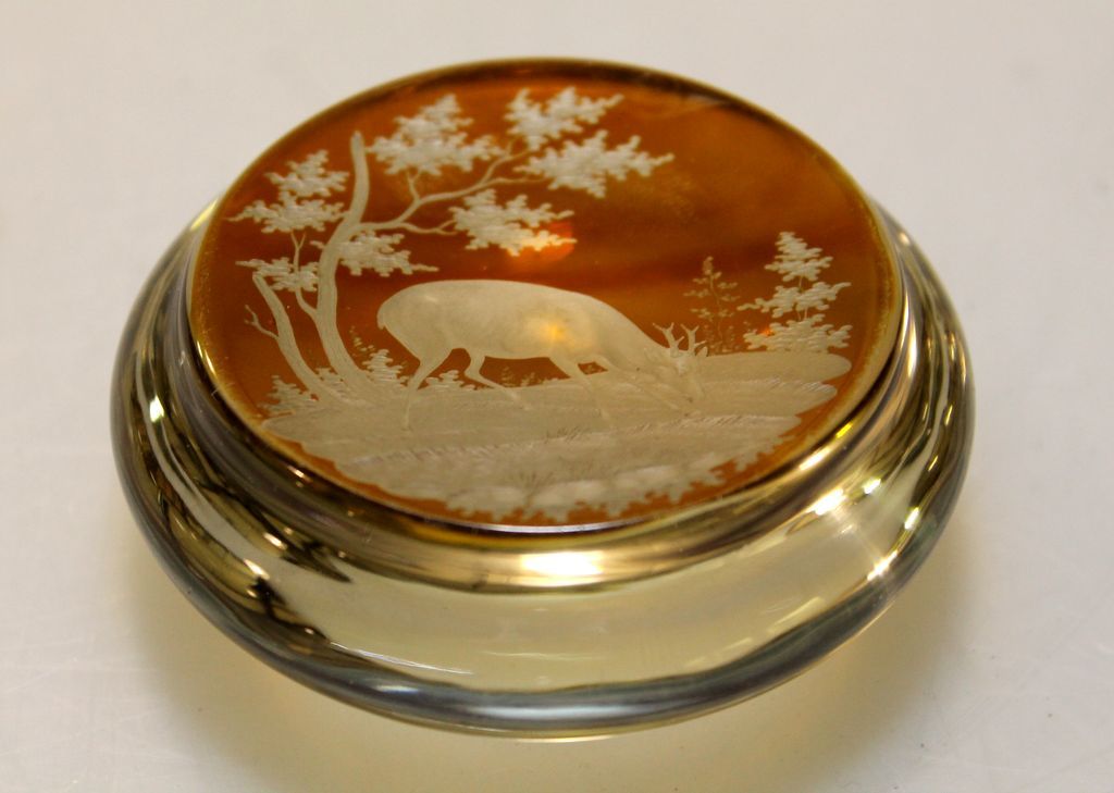 Small etched Bohemian paperweight of deer.; 3" dia.