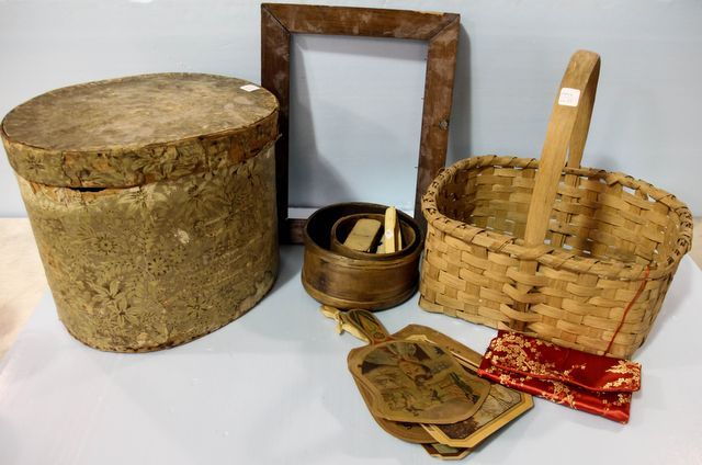Victorian paper covered hat box, basket, five paper fans and antique frame 13 1/2" w., 18" h.