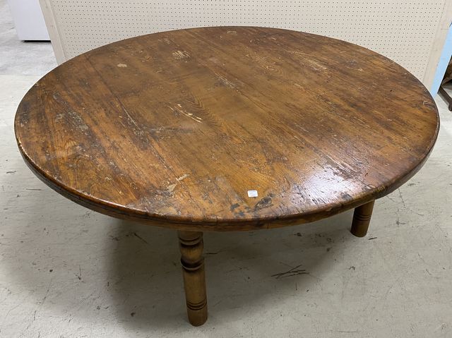 Farm House Style Oak Round Dining Table, four tapered legs, aged finish, scratches, scuffs, 28"h., 64"dia.